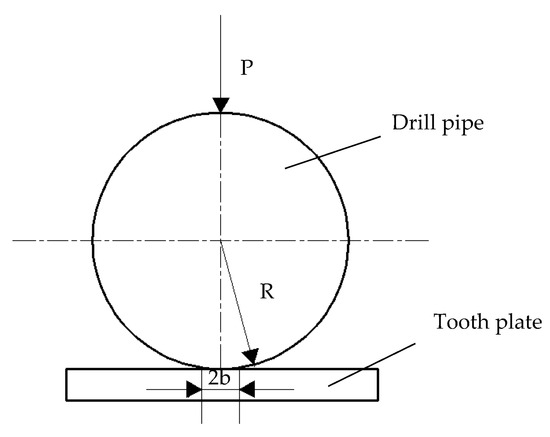 During the operation of the wellhead machinery, the motion pairs consisted of the tooth plate and the drill pipe, which contacted each other and produced relative motion under the external load. Therefore, the friction contact between the tooth plate and the drill pipe could be considered linear sliding friction pairs. Figure 1 shows the schematic diagram of the tooth plate and the drill pipe. It can be seen from Figure 1 that the drill pipe made contact with the tooth plate under load conditions. The load applied on the drill pipe is P. The radius of the drill pipe is R. Elastic moduli of the friction pairs are E1 and E2, respectively. Their Poisson ratios are ε1 and ε2. E′ is the equivalent elastic modulus. b is the half-width of the contact area.