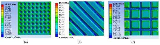According to the load conditions of the sliding friction pairs of the above three different types of micro-textured surfaces, the equivalent contact stresses are obtained, as shown in Figure 3. It can be seen from Figure 3 that stress concentration zones are focused on the left and right sides of the three types of micro-textured surfaces. In addition, the equivalent stresses of the left sides are larger than that of the right sides, which indicates that the left sides of the textured surfaces are more worn than the right sides along the sliding direction. The maximum equivalent stress of the three micro-textured surfaces is 10.275 MPa, 17.093 MPa, and 12.885 MPa, respectively. The stress gradient on the surface of the micro-groove textures is the largest compared with other textures. The simulation results show that the wear resistance of the micro-dimples is better than that of the micro-grooves and the reticular grooves.