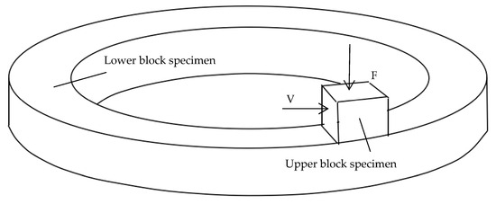 The dry friction test was conducted by the wear testing machine (MMH-5UMT-2, CETR, San Jose, CA, USA). The mechanism of surface contact friction is shown in Figure 4. The lower surface of the upper block specimen contacted the upper surface of the lower block specimen and slid counterclockwise. The upper specimen is a block (20 mm × 20 mm × 10 mm). The lower specimen is a fixed annular block (inner diameter 340 mm, outer diameter 380 mm) with a surface roughness of Ra12.5 μm.
