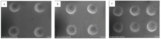 The Nd: YAG laser was used to fabricate the textures at the average laser power of 200 W and a frequency of 5 Hz (DPL20-532, CHUTIAN, Wuhan, China). According to the sizes of the above simulation design, three kinds of micro-structures, which included micro-dimples, micro-grooves, and reticular grooves, were prepared on the friction surface of the upper block specimen. Furthermore, two groups of textured specimens with spacing of 1.5 mm and 1.8 mm were prepared for the micro-dimples. Micro-dimples were fabricated by using the fixed-focusing processing method. The micro-grooves and the reticular grooves were created by utilizing the laser scanning processing method. The work platform was moved during the laser texturing process. Table 2 shows the laser texturing parameters. Due to the existence of molten metal sputtering on the surface of the micro-structure fabricated by laser, the specimen was repeatedly polished with sandpapers (200#–2000#) of different grain sizes after laser texturing. Then, the particles produced from the wear were removed by an ultrasonic cleaning machine (DA-968, DADI, Nanning China). Figure 5 shows the surface morphology of micro-grooves and reticular grooves observed under a three-dimensional microscope with a super depth of field(VHX-2000, Hitachi, Tokyo, Japan). Figure 6 shows the surface morphology of three kinds of micro-dimples with different spacing observed with the scanning electron microscopy (S-3400N, Hitachi, Japan).