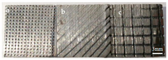 Under the condition of the same textured area occupancy, the wear resistance of three types of laser micro-textured surfaces such as micro-dimples, micro-grooves, and reticular grooves, were compared. Figure 7 is the surface topography of three different laser-textured specimens after the friction test.