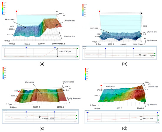 Figure 8 is the three-dimensional surface topography of the untextured specimen surface and three kinds of laser micro-textured surfaces. It can be seen from Figure 8 that the different kinds of specimen surfaces have clear boundaries between the worn areas and the unworn areas. In Figure 8b–d, the worn areas and unworn areas of specimens all have micro-textures. The height differences between the unworn zone and the worn zone in the figure are used to evaluate the thickness of each wearing layer.
