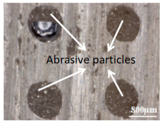 Figure 10 shows the textured specimen with micro-dimples (the diameter of the dimple is 0.8 mm, the spacing is 1.8 mm) after the friction test for 5 min. After the friction test, the specimen was cleaned by ultrasonic cleaning machinery, and there were obvious particles in the dimples, which indicates that a large number of abrasive particles were produced in the process of friction tests. These abrasive particles play an important role in the wear of the specimen. The micro-dimples have the ability to trap debris, which decreases the effect of abrasive wear and improves the tribological properties at the interface.