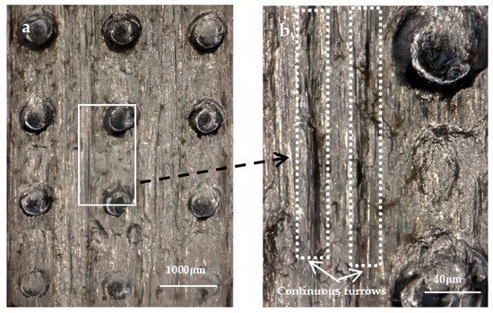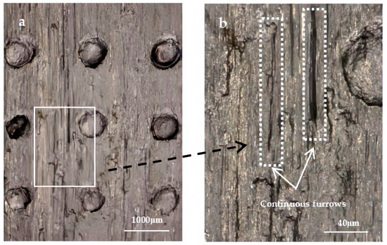 Figure 11, Figure 12 and Figure 13 show the morphology of the specimen after the friction test when the dimple spacings are 1.8 mm, 1.5 mm, and 1.2 mm, respectively. By comparison, it can be found that the surface wear of the three laser-textured specimens with different spacing has similar characteristics. In the vertical direction, which is the friction direction of the specimen, obvious continuous furrows appear in the untextured area among adjacent rows of dimples. In the horizontal direction, there is no furrow among adjacent rows of dimples. It indicates that abrasive wear occurred on the surface of the specimens during the dry friction test, and obvious furrows were formed in the untextured region. While in the textured region, the continuous formation of furrows is prevented by the dimples distributed in the array.