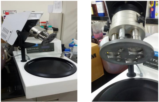 Stainless steel (Grade 304) flat specimens of Rockwell hardness B98 and a 30 mm square cross-section were laser cut from a single stock of 4 mm thickness; the square faces were ground and polished to mirror-finish using a table grinder fitted with a custom sample holding attachment as shown in Figure 1.