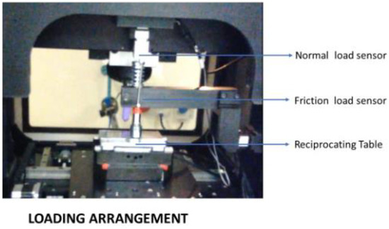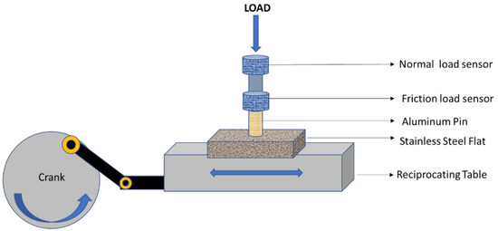 We used virgin sandpaper of P320, P800, P1200, and P2000 grit to create test specimens on mirror-finished stainless steel surfaces; 20 mL of water was sprayed using an atomizer bottle as the grinding lubricant, and the grinding time was controlled to 60 s. These machined specimens were tested for sliding friction on a pin-on-flat reciprocating tribometer for 1800 cycles; the reciprocating table was driven by a scotch yoke mechanism with a constant stroke length of 20 mm. A schematic of the tribometer and the loading arrangement is shown in Figure 2 below.