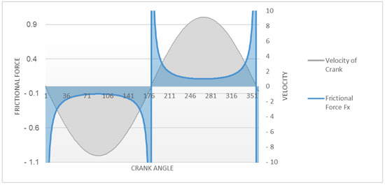 The frictional force “Fx” as per the classical Stribeck curve, during boundary and mixed regime of lubrication, has an inverse relationship with the sliding velocity at the contact zone. The X axis of the Stribeck curve is represented as the dimensionless Hersey Number, represented as “η·N/P”, where “η” is the viscosity of lubricant in Ns/m2, N is the relative velocity in m/s, and P is the load (newtons) per unit area. When this dimensionless number increases, the regime of lubrication shifts to the right. As the relative velocity designated by “N” increases, the film thickness of the lubricant film in the contact zone also increases [18], moving the lubrication regime to the right of the Stribeck curve.