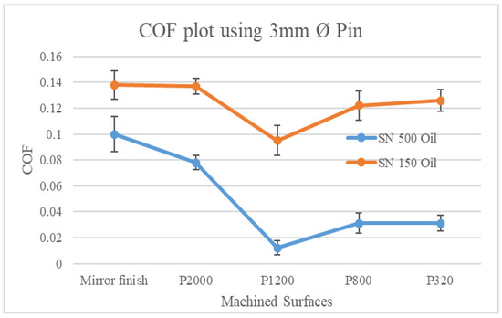 Cycle average COF for different topographies using a 3 mm diameter pin. The P1200 finished surface shows the lowest coefficient of friction.