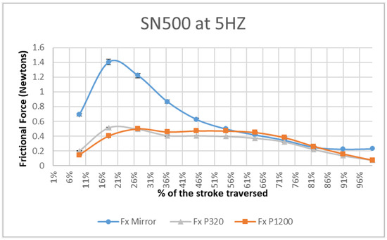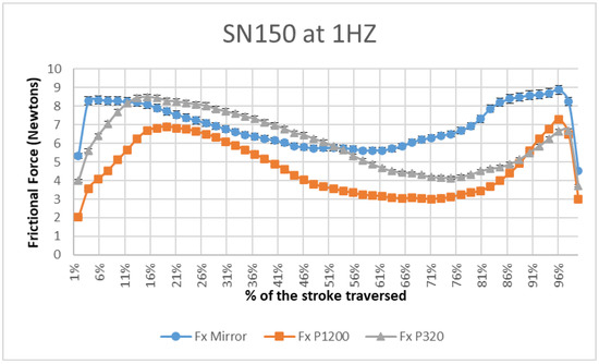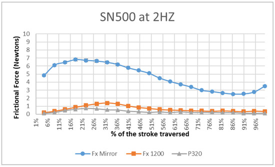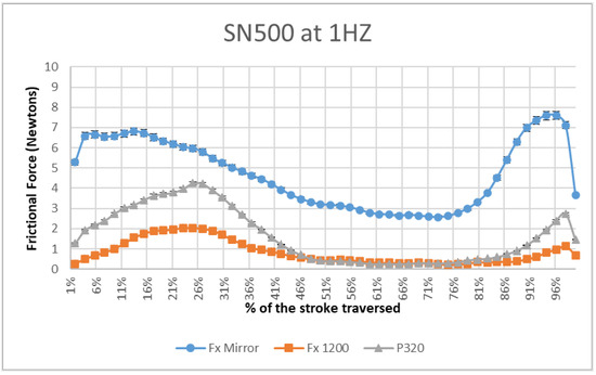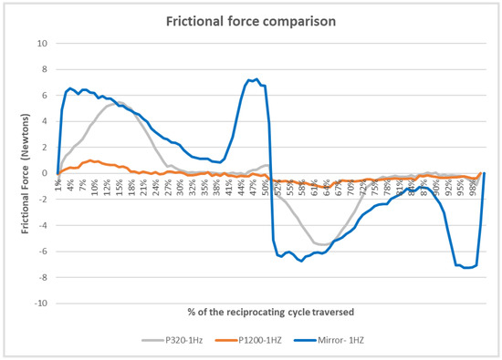 When the reciprocating frequency was increased to 2 Hz as seen in Figure 8, the P320 and the P1200 surfaces had nearly overlapping plots, with the P1200 surface having about a 1 N higher magnitude of the peak frictional force. The lowest friction on all surfaces was evident in the decelerating regime just beyond 80% of the stroke traversal. The friction peak on the mirror surface was nearly 70% higher than on the ground surfaces.