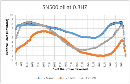 Average frictional force plot at 0.3 Hz for the different surfaces using SN 500 oil.
