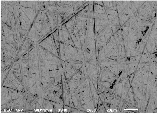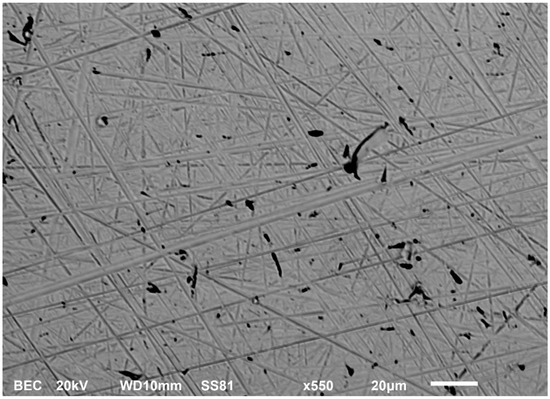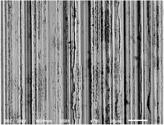 Back-scattered SEM image of the P320 finished surface after completion of the sliding test at 1 Hz. Abrasive scouring marks were observed on the surface.