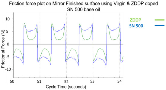 Friction force plot on the mirror-finished surface using virgin and ZDDP doped SN 500 base oil.
