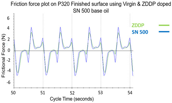 Since adhesive wear dominated during the sliding of the mirror-finished surface, we further observed the frictional force plots after doping our test oil with a tribofilm-forming additive that limits the adhesive wear mechanism. A primary alkyl, zinc di-alkyl di-thiophosphate (ZDDP), of a molecular weight of 716.38, having 9% by weight of zinc and 8% by weight of phosphorous, was used for this test. Zhang et al. [33] noted that ZDDP protects the mating surfaces from adhesive wear by reacting with the parent steel surface to form a sacrificial tribolayer; this was triggered by localized heating and pressure build-up at the contact zone. In Figure 13, the frictional force is plotted against the sliding interval and overlaid with the doped and undoped oil. After doping, the sliding friction drops to the minimum at the middle of the stroke where the sliding velocity is the maximum and increases as the velocity decreases until the direction reversal happens. Comparing it with the undoped oil, the friction is seen to be high at the middle of the stroke, indicating adhesion. On the P320 finished surface, as seen in Figure 14, there is no visible effect of the introduction of the tribofilm on the sliding friction. This observation supports the hypothesis that adhesive friction was dominant during sliding on the mirror-finished specimens and relatively insignificant during sliding on a rougher surface like the P320.
