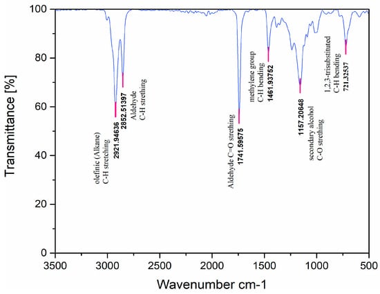 Infrared spectroscopy was used to characterize the molecular structure of the formulated TMPTO base oil, as depicted in Figure 1. Olefinic (alkane) C-H stretching and bending vibration peaks were observed at 3004.38 cm−1 and 1461.37 cm−1 to 1354.68 cm−1, respectively. Peaks for the carbonyl (C=O) stretching vibration and methylene (C-H) bending vibration were observed at 1740.90 cm−1 and 1461.37 cm−1, respectively. Trimethylolpropane trioleate (TMPTO) peaked at 721.33 cm−1 due to its long alkyl chain.
