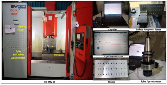 Drilling experiments were performed using HSS drill tools on a BFW Chakra BMV 60 CNC machining center. Thrust force and torque measurements were captured using a wireless Spike tool holder dynamometer. Experimental cutting force values were monitored and recorded using a data acquisition system, as depicted in Figure 2.