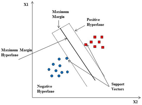 Support vector machines are used to classify data points based on a hyperplane in N-dimensional space (N-number of features), as shown in Figure 4. As a result, several possible hyperplanes can be used to separate the two data points [36]. The objective is to find a plane with the maximum margin, representing the maximum distance between two data points. By increasing the margin’s distance, future data points can be classified with greater confidence because they will be reinforced with some reinforcement. Data points are classified using hyperplanes, which are decision boundaries. Depending on which side of the hyperplane the data points fall on, they can be classified into different categories.