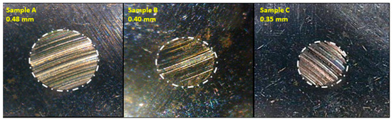 A microscope was used to measure the diameter of the wear scars on the surface of the test ball. In comparison to lube oil A (0.44 mm) and lube oil B (0.40 mm), lube oil C showed the smallest AWSD (0.37 mm) and best AW properties, as shown in Figure 6.
