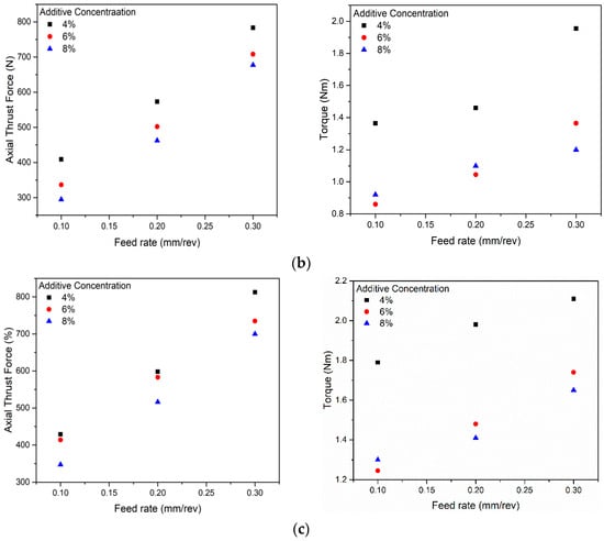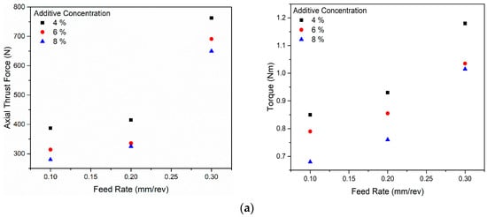 A summary of the experimental values is shown in Figure 7. It is evident that cutting parameters and cutting forces are correlated. Despite the increased additive concentration, both cutting forces remained minimal and stable. Increasing feed rate increased cutting forces. Based on the results of Wei et al. [37], the change in thrust force concerning spindle speed is minimal or negligible. Therefore, this study’s result is consistent with the results we found for drilling aluminum alloys. Furthermore, twenty-seven (27) drilling experiments were conducted utilizing a Taguchi-based orthogonal array design. The thrust force and torque were individually modeled using a polynomial mathematical model, allowing for the independent analysis and optimization of these parameters.