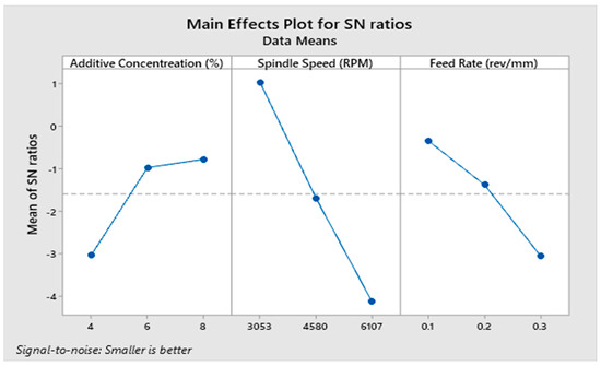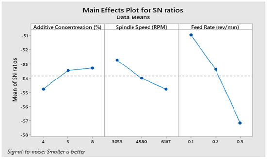A preliminary screening result of AW/EP was used to select the blend for this investigation. Three levels, as well as three key control factors, were considered in this investigation. For the most effective type of lube oil, the control factors and corresponding levels were additive concentrations, with a 4%, 6% and 8%, spindle speed; 3053 RPM, 4580 RPM and 6107 RPM; and a feed rate of 0.1 mm; 0.2 mm, and 0.3 mm. The level of control factor determines values taken for the experiment. The experiment was conducted using the L27 orthogonal array. Under Taguchi’s orthogonal array, the proposed investigation entails the conduction of 27 experiments. In order to analyze the variance and single-to-noise ratios of the results, each response parameter was replicated twice, leading to a total of 54 observations. Upon completion of the experiment, the response parameters are transformed into a signal-to-noise (S/N) ratio. Calculated S/N ratio values are compared to the obtained results to see if they deviate from or are close to them. In the present study, the objective function follows a “smaller is better” approach, as indicated by Equation (1). This is because all the response parameters are anticipated to have smaller values for improved performance.