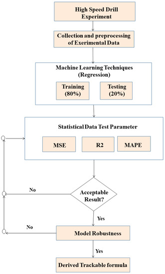 Four different regression-based machine learning models were used to predict the response parameters of high-speed drilling operations. Figure 11 shows the proposed scheme for predicting response parameters using machine learning techniques. In this session, 54 data points derived from the experimental data were used to create and test the model. The 80% input data were randomly selected to train the model, and the 20% input data were used for testing and model evaluation.