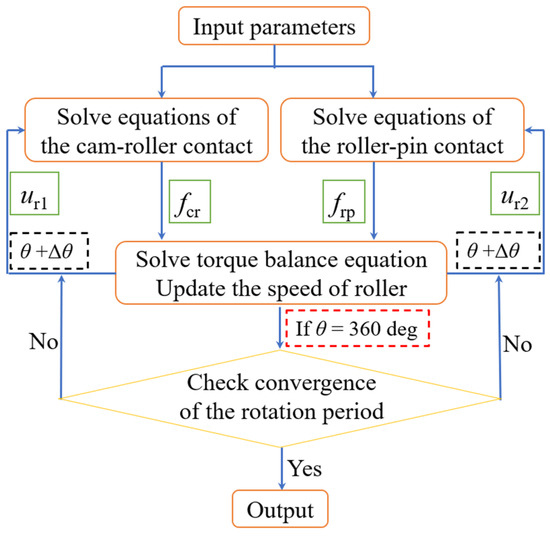 The cam-roller unit consists of two independent and associated motion pairs, as shown in Figure 1. The key control equations and the coupling connection equation are also provided. The solution of the lubrication model is based on the non-dimensionalization of Equations (1)–(13). The specific process is shown in Figure 2. The solving process of the two lubrication models is similar to that presented in [24,29], and thus it is not presented in this study. It is important to mention that the friction force can be obtained by lubrication analysis of two motion pairs under a certain cam rotation. Using the torque balance equation (Equation (1)), the roller’s angular acceleration can be determined, and the rotation speed of the roller at the next angle (i.e., the updated roller speed) can be obtained. The lubrication analysis goes to the next rotation angle, and the process is repeated again. Finally, the lubrication state of the cam-roller unit at each rotation angle in a complete cycle is obtained.
