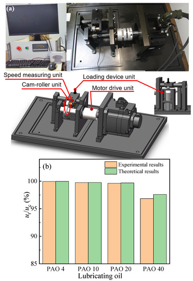 To tackle the cam-roller unit issue, experimental studies are also conducted. Figure 3a shows the self-designed and manufactured skidding test bench and its key functional units. The initial load is set by the loading device unit, which uses the same parts as a certain type of internal combustion engine. The motor drives the cam to rotate actively, while the roller follows the movement. Magnetic sheets are installed on the side of the roller. The movement of the roller makes the magnetic field change. The giant magnetoresistive (GMR) sensor is used to collect the signal frequency, and then the speed of the roller is obtained to achieve skidding measurement. At normal temperature (22 °C), the skidding between the cam and the roller is measured using different lubricating oils (equivalent to different oil viscosities), where the cam speed is 800 r/min and the initial load is 250 N. Furthermore, the same operating parameters are used for theoretical simulations. The obtained experimental and theoretical results are shown in Figure 3b. It can be seen that the experimental results are consistent with the theoretical results regarding the influence of lubricating oil on skidding, especially at the speed ratio ur/uc under relatively low viscosity conditions. Therefore, the coupling simulation model of cam-roller and roller-pin can reflect the skidding situation between the cam and the roller.