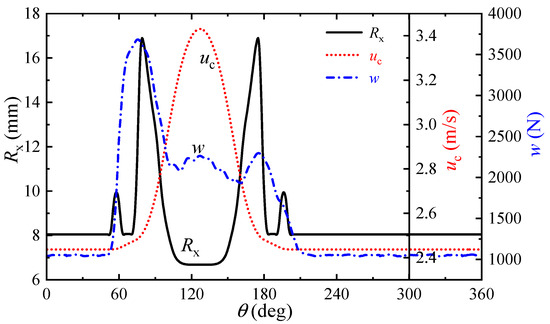 Changes in the comprehensive curvature radius, cam surface velocity, and load spectrum in a complete cam rotation cycle.