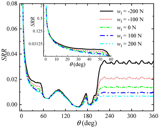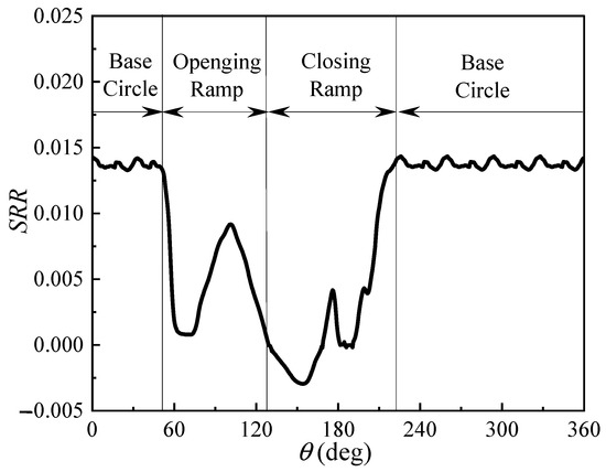 According to the above skidding condition, the slide-roll ratio variation between the cam and the roller in a complete cam rotation cycle is obtained, as shown in Figure 6. It can be seen that the slide-roll ratio remains relatively constant and increases with the rotation angle of the cam base circle. This is because the working condition parameters are almost unchanged in the rotation angle of the cam base circle (Figure 4). Moreover, according to the torque equilibrium formula (Equation (1)), it is necessary to apply enough driving torque to drive the roller to rotate. However, the contact load of this part is relatively low, and thus the friction coefficient should reach a certain relatively large value to realize the driving of the roller, which requires a relatively large surface speed difference between the cam and the roller. In the opening and closing ramps of the cam (54–200°), the value of the slide-roll ratio changes significantly. At the beginning of the cam opening ramp, the contact load increases sharply and the lubricating oil film decreases. Large surface speed differences are no longer required to achieve the required driving torque for the roller, and thus the slide-roll ratio decreases rapidly. When the cam lift increases, the surface velocity of the cam also starts to increase. This requires the roller to accelerate to follow, and the driving force required by the roller will inevitably increase. The slide-roll ratio starts to show an upward trend to obtain a relatively large friction coefficient. Although the contact load at this stage is relatively lower than at the initial stage of the cam opening ramp, it is still relatively large. Therefore, the rising amplitude value of the slide-roll ratio (θ ≈ 100°) does not exceed its value in the rotation angle of the cam base circle. Afterwards, the increasing trend of the cam surface velocity gradually slows down, and the driving torque required by the roller also decreases. The slide-roll ratio also shows a downward trend, and even its value is almost zero at the cam tip position. The cam starts to enter the closing ramp stage, and its surface velocity decreases accordingly. At this time, the roller still has a high speed. The latter only depends on the impedance torque between the roller and the pin to produce the deceleration effect, which is less than the deceleration degree of the cam surface velocity. Consequently, the surface velocity of the cam is less than that of the roller. However, once there is a surface velocity difference between the cam and the roller, the contact pair will generate an impedance torque of the roller movement, which functions with the impedance torque of the roller-pin pair to reduce the rotational speed of the roller. The slide-roll ratio has a small negative value (|SRR| < 0.003). As each parameter gradually returns to the working condition of the cam base circle, the slide-roll ratio also returns to a relatively stable value. It can be seen that the intrinsic requirement of the cam-roller unit causes the change in the slide-roll ratio, which is related to the coupled lubrication state of the cam-roller contact and roller-pin contact at each cam rotation angle.