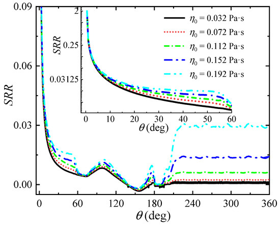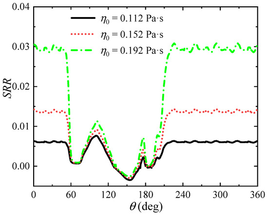 Figure 18 shows the effect of oil viscosity on the slide-roll ratio during a complete cam rotation at startup and steady running. It can be seen that the change of the slide-roll ratio in the range of 0–7° is hardly affected by the oil viscosity. At this time, the roller has just started to move from its stationary state. The surface velocity of the cam and roller is relatively small. The effect of viscosity has not been highlighted. Afterwards, as the cam continues to accelerate, the curves of the slide-roll ratio start to show significant differences at different oil viscosities. The larger the oil viscosity, the greater the slide-roll ratio. This can be attributed to the fact that oil viscosity affects the friction coefficient frp of the roller-pin contact (Figure 19). High viscosity can increase the impedance torque of the roller. It is worth mentioning that during the steady running process, this is consistent with the previously discussed influence of oil viscosity, and the effect of oil viscosity is higher than that in the startup process.