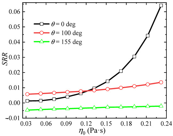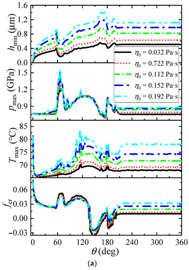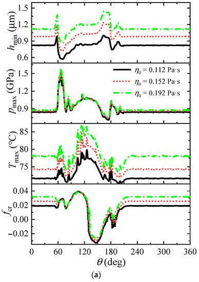 In order to further analyze the influence of oil viscosity on skidding, the slide-roll ratio is plotted as a function of viscosity at three special points (0°—located in the cam base circle part and 100/155°—located at the local maximum positive/negative value of the slide-roll ratio in the non-cam base circle part), as shown in Figure 9. It can be seen that the slide-roll ratios at the three cam rotation angles are affected by the oil viscosity to different degrees, with the most drastic change at 0° and relatively weak changes at 100° and 155°. As previously mentioned, the sensitivity of the slide-roll ratio to the oil viscosity is always affected by the contact load. For 0° and 100°, the increase in oil viscosity can increase skidding between the cam and the roller. Especially for the rotation angle of the cam base circle part (0°), when the oil viscosity is greater than 0.112 Pa·s, the changing curvature of the slide-roll ratio is greater than 10%. In other words, if the oil viscosity is less than 0.112 Pa·s, the skidding phenomenon will no longer be very sensitive to the change in oil viscosity. It is important to mention that at 155°, the skidding slightly decreases with increasing oil viscosity. This is due to the increase in the impedance torque of the roller-pin pair with increasing oil viscosity (Figure 10), and only the small impedance torque provided by the cam-roller pair can reduce the roller following speed. In addition, the oil viscosity affects the minimum film thickness, maximum temperature increase, and friction coefficient, as shown in Figure 10. Moreover, the lower the oil viscosity, the better the maximum temperature increase of the cam-roller unit and the friction coefficient of the roller-pin pair. However, low viscosity leads to a smaller minimum film thickness, and the friction coefficients at 100° and 155° increase with decreasing viscosity. These conditions limit small values of oil viscosity to ensure good lubrication in the cam-roller unit. In general, choosing an oil with low viscosity can reduce skidding without affecting the effective lubrication of the cam-roller unit.