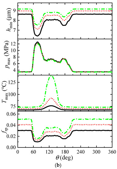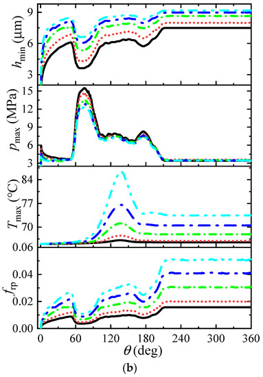 In addition, by comparing the two stages of 0–180° and 180–360°, it can be deduced that the influence of oil viscosity on skidding in the accelerated rotation stage is significantly weaker than that in the rated rotation stage. This is directly related to the lubrication state of the cam-roller unit (Figure 19). During the acceleration stage, the cam speed is relatively low, which mainly leads to a small film thickness and a temperature increase in the cam-roller unit. The lubrication state is less sensitive to oil viscosity. In addition, the friction coefficient of the roller-pin contact is lower than that of the constant rotation stage. This results in a reduced influence of oil viscosity on skidding during the acceleration stage. Therefore, oils with low viscosity should be used to reduce skidding on the premise that an effective lubricant can be formed quickly in the contact area.