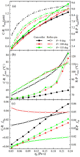 Variation of the minimum film thickness (a), maximum temperature (b), and fiction coefficient (c) with the viscosity in the cam-roller unit.