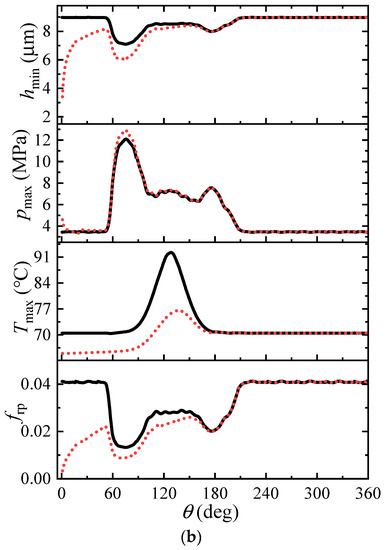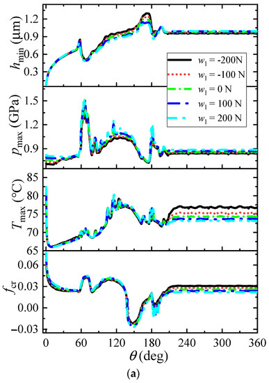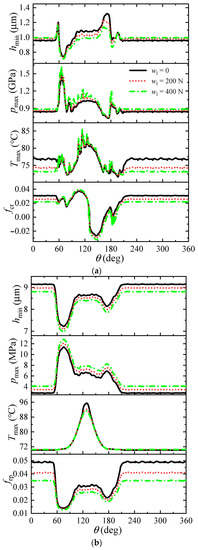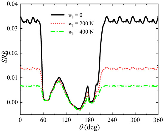 In the internal combustion engine, the cam and roller are theoretically designed in the pure rolling state. However, in practice, there is a skidding phenomenon between them. Is there consistency in the working conditions of the cam-roller unit under the two operating states (skidding and pure rolling)? Therefore, the lubrication states are obtained in a cam rotation cycle under the conditions of skidding (uc ≠ ur1) and pure rolling (uc = ur1), as shown in Figure 5, where the lubricant viscosity (η0) is equal to 0.152 Pa · s and the modified load (w1) is null. On the one hand, it can be deduced from the overall perspective trend of the minimum film thickness, maximum pressure, maximum temperature increase, and friction coefficient that the lubrication state of the cam-roller unit is stable at the rotation angle of the cam base circle part, while the lubrication parameters change significantly at the other rotation angles. This corresponds to the changes in the operating condition parameters such as cam curvature, cam surface velocity, and applied load in Figure 4. The lubrication analysis results can reflect the lubrication state of the cam-roller unit under different working conditions in real-time. On the other hand, the existence of skidding between the cam and the roller has almost no effect on the lubrication state of the roller-pin pair. In fact, even after skidding occurs, it will not greatly change the roller speed, which can be verified by the slide-roll ratio shown in Figure 6. For the same reason, the influence of skidding on the minimum film thickness and the maximum pressure is also very small in the cam-roller pair, while the maximum temperature rise and the friction coefficient will be greatly affected. Even a small skid on the surfaces between the cam and the roller can make the friction coefficient no longer equal to zero, which changes the temperature of the contact zone. Therefore, the skidding phenomenon between the cam and the roller mainly affects the temperature rise and the friction coefficient of the lubrication state in the cam-roller unit.