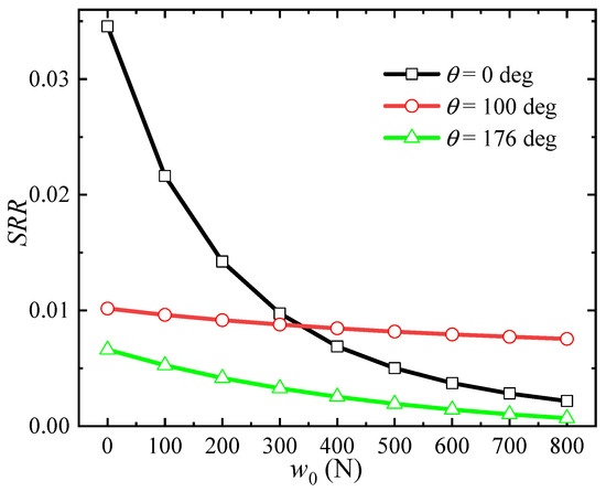 Figure 13 shows the variation of the slide-roll ratio as a function of the modified load at three special angles (0°—located in the cam base circle part and 100/176°—located at the convex peak of the slide-roll ratio in the non-cam base circle part). It can be seen that at the three cam rotation angles, the slide-roll ratio decreases as the modified load increases. When the modified load increases, the friction coefficient in the contact zone decreases (Figure 14), and the surface sliding value between the cam and the roller decreases. Due to the relatively small initial load in the cam base circle part, a certain amount of modified load accounts for a large proportion of the total contact load. However, the proportion of modified loads is relatively small in the non-cam base circle part. Consequently, the change in slide-roll ratio is large at 0° and relatively small at 100/176°. Similarly, the changing curvature gradually decreases with increasing modified loads, especially at 0°. In order to reduce the degree of skidding, a larger initial load should be chosen. However, the increase in the contact load will lead to a decrease in the film thickness and an increase in the pressure in the cam-roller unit (Figure 14), which is unfavorable to the lubrication state. Therefore, the initial load can be increased to improve the skidding condition, but it cannot cause an oil film rupture or severe pressure concentration in the contact zone.