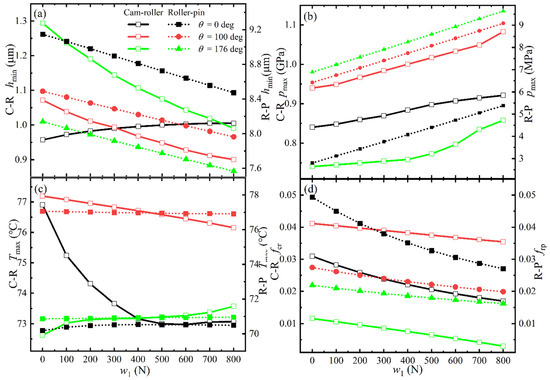 Variation of the minimum film thickness (a), maximum pressure (b), maximum temperature (c), and friction coefficient (d) with the modified load in the cam-roller unit.