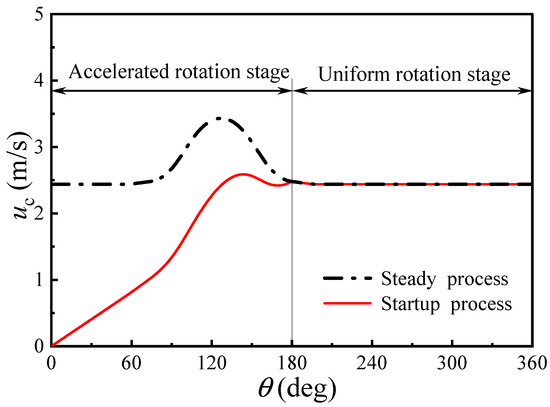 The startup process of the internal combustion engine is an inevitable part of its operation. Therefore, the cam-roller unit must undergo a startup running process where the cam drives the stationary roller to accelerate to the rated speed. This study analyzes the skidding situation in this process by considering that the camshaft starts with a constant angular acceleration and reaches the rated cam rotational speed (nc) at 180°. Figure 15 shows the variation of the cam surface velocity, where the accelerated rotation stage is 0–180° and the constant rotation stage is 180–360° during the startup running process.