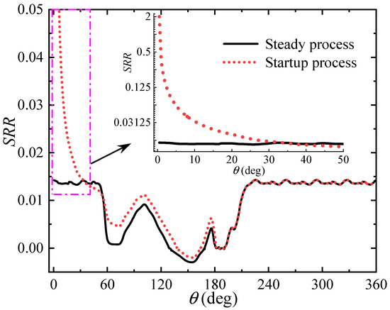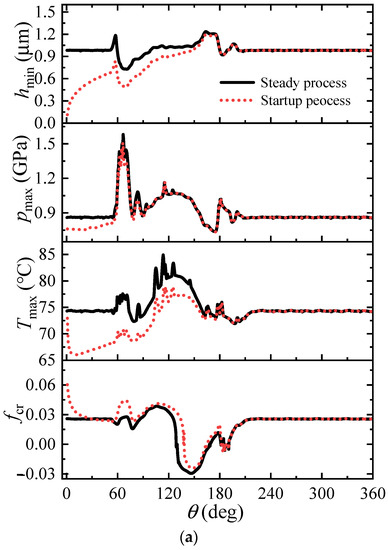 The slide-roll ratio between the cam and the roller is plotted under the steady/startup running conditions of η0 = 0.152 Pa · s and w1 = 0 N (Figure 16) to understand the characteristics of skidding during the startup process. It can be clearly seen that the skidding situation during the acceleration stage of the startup running process is different from that in the steady running process, but similar to the situation in the constant speed stage. This is related to the lubrication state of the cam-roller unit (Figure 15). At the beginning of the startup stage (0–18°), the difference in slide-roll ratio is greater than 50% because the cam needs to drive the stationary roller to start moving. Although a large slide-roll ratio produces a large roller driving torque (that is, a large friction coefficient fcr in Figure 17), it cannot realize the synchronous acceleration of the cam and the roller. However, it can gradually reduce the slide-roll ratio. In addition, a lubrication film is formed in two contact zones, and its thickness gradually increases. Within the cam rotation angle of 34–54°, the slide-roll ratio during startup is slightly lower than that in steady process (the difference is less than 5%). This may be due to the cam and the roller reaching a relatively stable state before entering the cam opening ramp. During the acceleration stage, the roller has a relatively lower rotational speed than that in the steady running condition, which indicates that the impedance torque (see from frp in Figure 17) and the moment of inertia exerted on the roller are small. Therefore, the driving torque generated by the relatively small slide-roll ratio can achieve the desired acceleration. The change in working conditions then breaks the dynamic balance of the cam-roller unit, making the slide-roll ratio higher than that in the steady running process again. As the cam speed gradually approaches the rated speed, the gap between the slide-roll ratio and the lubrication state in the two conditions also gradually decreases. When the cam rotation angle exceeds 180°, the conditions for steady and startup processes are the same. That is, the slide-roll ratio and the lubrication state in the cam-roller unit are no longer different. In general, skidding is more obvious during the startup running process, especially at the beginning of the acceleration stage, where skidding is very severe and the lubricating oil film thickness is small.
