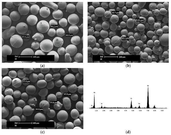SEM micrographs of the NiCrBSi powders: (a) KS-IC-45; (b) KS-IC-55S; (c) KS-IC-55; (d) EDX spectrum of the NiCrBSi powders.