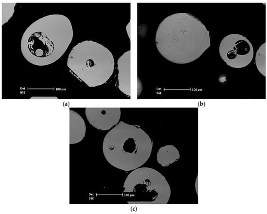 For a more detailed characterization, the powders were analyzed in cross-section to observe their inner structure. Figure 2 shows the NiCrBSi feedstock powders in cross-section, with the particles presenting a uniform chemical composition but with large gaps in the center (internal porosity) for all three types of powders. These gaps are generally undesired since they lead to overheating of the particles during the spraying process, promoting more intense oxidation and delivering a coating with two types of porosity, an interconnected one (interlamellar porosity) resulting from the layer-by-layer coating formation, and a closed one that may arise from the internal porosity of the particles []. Due to this fact, a subsequent heat treatment is in this case strongly recommended; this brings the coating to a semi-molten state, eliminating not only the voids obtained during the deposition process but also the internal pores attained from the particles’ structure.