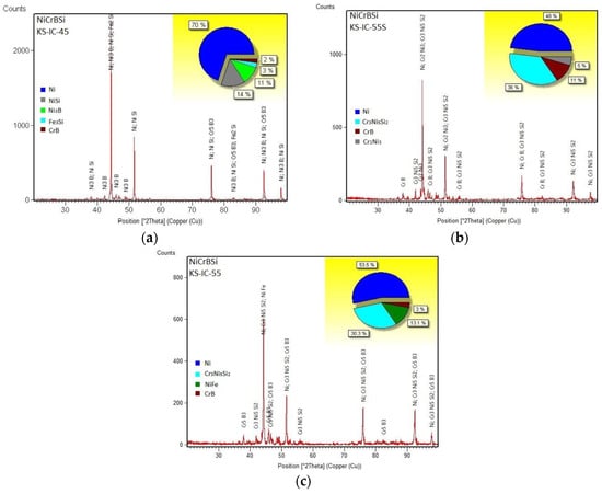 Figure 3 shows the diffraction patterns of the three NiCrBSi feedstock powders, revealing their main initial phase compositions. The complexity of the NiCrBSi system enables the formation of different phases according to the elements’ ratios in the chemical composition of the powder. All the investigated powders present a high level of crystallinity, described by the occurrence of well-defined peaks. The KS-IC-45 powder, having around 6 wt.% Cr and a higher Ni content, consists mainly of 70% Ni (cubic), 14% NiSi (orthorhombic), and 11% Ni3B (orthorhombic). The KS-IC-55S powder, with a greater Cr content (10 wt.%), presents in the structure only 48% Ni; besides this, there is a 36% ternary Cr3Ni5Si2 transition metal silicide phase crystallized in the cubic system that arises due to the increased chromium content. This specific phase is beneficial for the tribological behavior since it has been frequently reported to perform excellently under dry sliding test conditions [] due to its intrinsic high hardness and strong covalent bonds []. Additionally, a 5% CrNi phase is detected, crystallized in the cubic system, and a greater content of hard polycrystalline orthorhombic boride CrB than that in the previously discussed powder is observed. The third powder, KS-IC-55 (containing 13 wt.% Cr) indicates similar phases to KS-IC-55S, but with a different percent distribution, including a smaller amount of ternary Cr3Ni5Si2 and an additional 13% intermetallic NiFe phase formed due to the slightly higher Fe content in the powder.