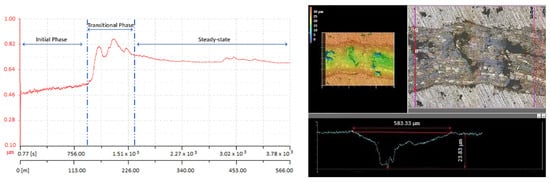 Regarding the wear tracks, it can be observed that the hard particles were dragged from the coatings during the sliding tests and microgrooves appeared, while the friction coefficient was very unstable. This reveals that the main wear mechanisms were abrasive and correlated with intense wear losses due to the poor intersplat cohesion typical of flame-sprayed coatings []. Furthermore, it is also observed that, depending on the chemical composition, once the Cr content increases the initial phase is extended and the COF remains at low values. For all three types of coatings, a transitional zone was observed that presents an anomaly in the case of KS-IC-45 powder, where the coefficient of friction jumps in this region to an approximately double value for a short period, and at the exit of the transitional zone, it stabilizes at an intermediate value, entering the steady state until the end of the measurement. Contrarily, in the case of KS-IC-55 powder, the steady-state zone did not appear in the measured range, and the test ended in the transition zone. The most stable COF with the lowest standard deviation was observed for the KS-IC-55S powder, which may be attributed to the increased content of the Cr3Ni5Si2 metal silicide phase.