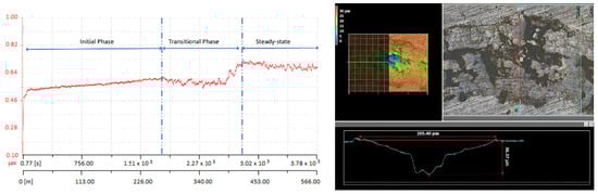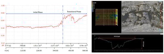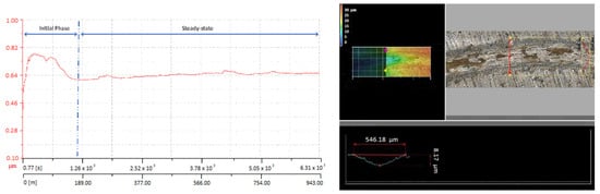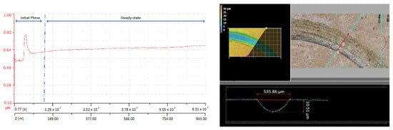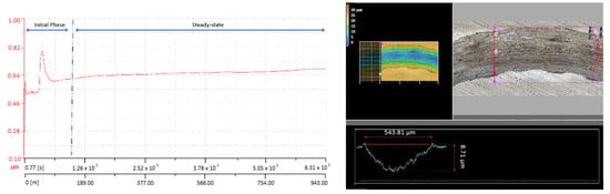 As can be seen in the COF evolution plotted against distance and time, as presented in Figure 6, Figure 7 and Figure 8, the superficial layer of the deposited coatings does not have a very good bond or stability since it presents only mechanical adhesion by clamping to the previously deposited layer. This leads to a very unpredictable friction behavior; in all cases, the COF is not stable during the measurement and presents a quite large deviation from the average value. The non-uniform wear track profile observed in the corresponding CLSM micrographs may be attributed to the low intersplat cohesion, which caused the facile pull-out of material. The worn surfaces show deep grooves and microcuts formed as a consequence of the abrasive wear mechanism. In the case of KS-IC-45 powder (Figure 6), it can be remarked that since it has a lower Cr content and reduced hardness due to a higher ductile Ni phase amount, after the first 226 m of the sliding testing, the COF stabilized because the softer asperities were more easily flattened by the hard WC-Co ball. In this situation, the COF values ranged from 0.5 to 0.86, with the maximum values being reached in the transitional phase, where some of the pulled-out particles were temporarily locked between the sliding surfaces. For the other two types of powders, a less stable friction coefficient was observed, and for the KS-IC-55S, a much finer wear track was measured (Figure 7), which may be due to the finer granulation of the powder compared to that of KS-IC-55 (Figure 8). In both cases, slightly smaller maximum COF values were observed, since the feedstock powders consist of harder Cr- and B-containing phases.