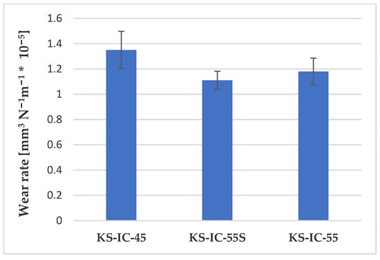 Furthermore, from the analyzed wear track segment, a semi-round worn section with a smaller width than that of the as-sprayed coatings was observed, which may be attributed to the lower degree of penetration of the counterpart in the material, resulting in a less pronounced wear rate for both partners. The best-performing remelted coating in terms of wear was the IC-KS-55S. The areas of the worn track cross-section and worn cap diameter, as determined by microscopic measurements, were used to calculate the specific wear of the inductively remelted coatings according to the Archard equation []. The bar chart presented in Figure 16 displays the average wear rates of the inductively remelted coatings and their standard deviation. The calculated values are in good agreement with similar NiCrBSi coatings reported in the literature [].