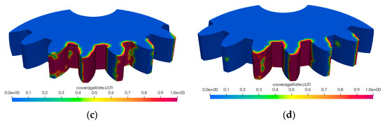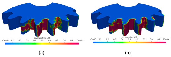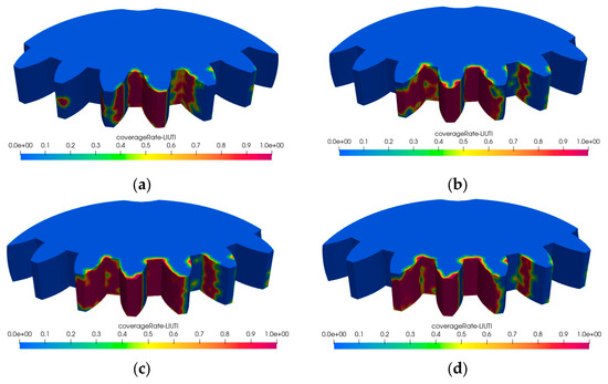 Coverage is a measure of test completeness and effectiveness. Under actual conditions, gear coverage correctly expresses the effectiveness of gear lubrication and heat dissipation, as indicated in Figure 6. The data resultdate file imported into Paraview software was read, the small gear surface oil distribution area was selected, and the coverage distribution cloud was obtained, as shown in Figure 6.