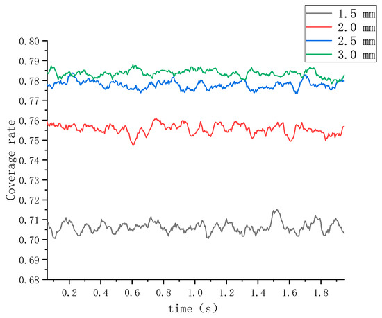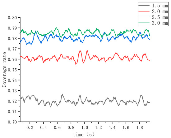 The pattern of change in coverage over time can clearly be seen in Figure 3. Although the curves are generally balanced, there are small fluctuations up and down. This is due to the fact that the gears are constantly moving during rotational meshing, and the contact area between the oil and the gear surface changes in real time. However, the dynamic balance will be maintained in the primary after stable operation. It was clear from the data reflected in the curves that when the gear diameter increased from 1.5 mm to 2.0 mm, the value of the gear coverage curve very significantly increased. When the incidence diameter was increased to 2.5 mm, the coverage value approached its maximum and then increased very slightly as the incidence diameter was further increased. As a result, the gear’s lubrication limit was set at 2.5 mm incidence diameter. The curves also showed that when the incidence diameter was 2.0 mm, the jets’ coverage values were considerable, and the total lubricating effect was optimal.