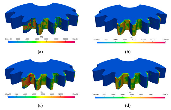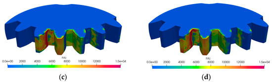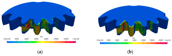 The HTC mode was selected in the visualization interface and a cloud diagram analysis was carried out to investigate the influence of internal heat dissipation during the meshing of high-speed rotating gears, as illustrated in Figure 8.