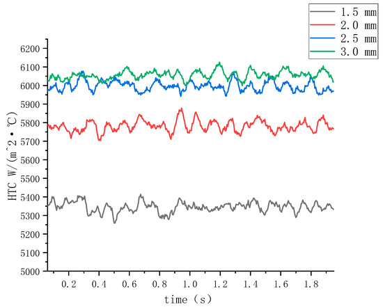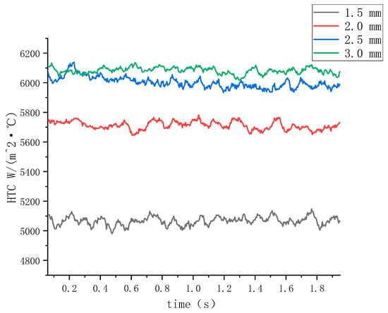 Similarly, in HTC mode, data from the small gear oil contact region were collected, which were imported into the origin to generate the image shown in Figure 9. Figure 9 clearly depicts the pattern of change in HTC throughout time. The data in the curve clearly reveal that as the gear diameter increased from 1.5 mm to 2.0 mm, the value of the HTC curve increased dramatically. As the incidence diameter reached 2.5 mm, the value of coverage increased to near-maximum and the incidence diameter continued to increase, while the HTC remained almost stable. As a result, an incidence diameter of 2.5 mm can be calculated as the gear’s lubrication limit. When the diameter of the gears was raised from 1.5 mm to 2.0 mm, there was a significant increase in the HTC on the gear surface.
