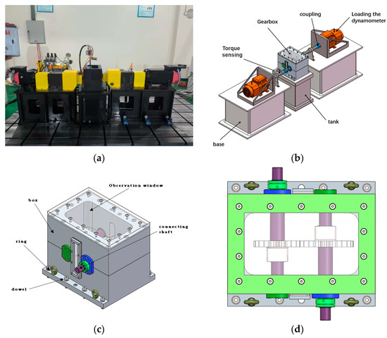 Experimental platform display diagram (a) The physical view of the test stand, (b) the 3D diagram of the test stand. (c) Overall schematic diagram of gearbox. (d) Top view of gearbox.