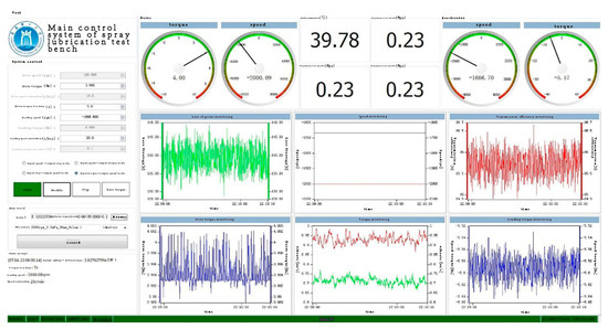 To make the experiment more general, a data acquisition system corresponding to the experiment was produced, as shown in Figure 11. The high-speed rotating gear injection lubrication software test system includes a drive system and a loading system, as well as a highly reliable frequency converter, PLC, and high-precision torque sensor, can achieve a maximum control speed of 8000 r/min. The software test system can monitor the testing process in real time. The software test system can be used to start and stop the drive motor to set the speed, turn the pressure control system on and off, set the loading torque, detect table system vibration, and obtain real-time transmission efficiency and vibration data to ensure the table’s stable operation and the reliability of the test data.