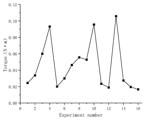 Figure 12 shows the original data from 16 sets of gear injection lubrication orthogonal tests. To facilitate the observation of patterns, the torque statistics for the injection lubrication test were collated and are presented in Table 2.
